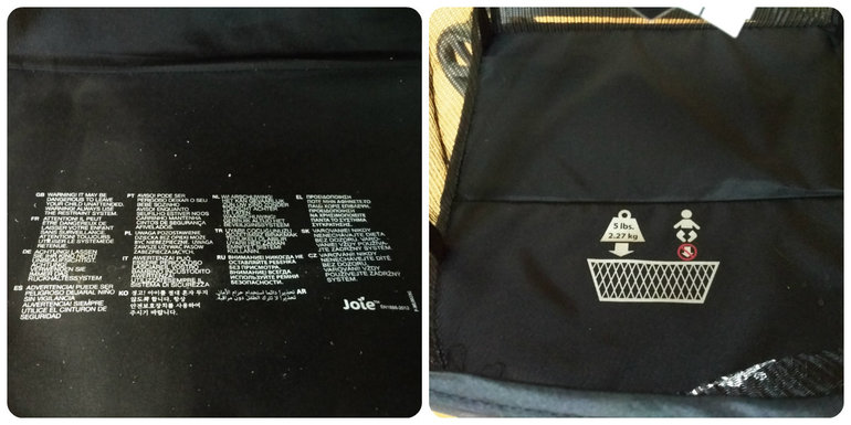 У Joovy понравилось то, что есть указание на вместительность корзины и особенно посмешил значок, что туда нельзя сажать ребенка. У Joie сразу на корзине написана инструкция по ее эксплуатации, в том числе и на русском языке. Хотя глядя на значок у Joovy Balloon, трудно не понять, что имели в виду. Видимо, были прецеденты.