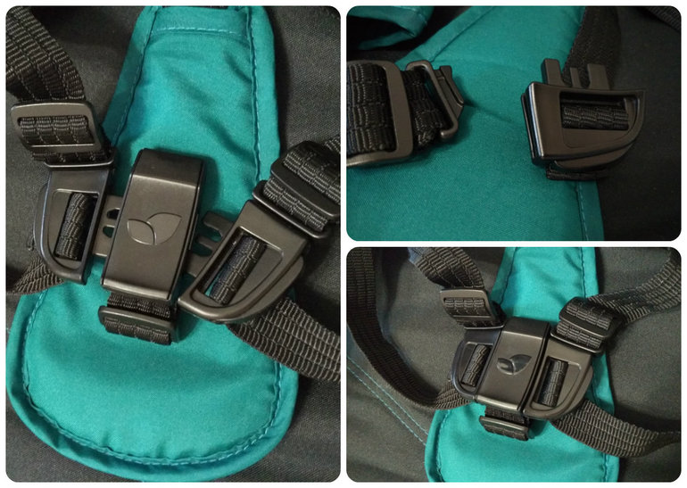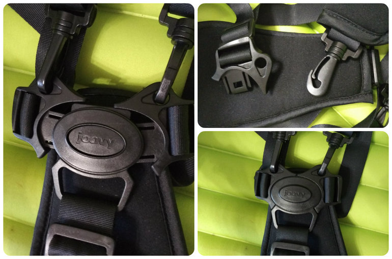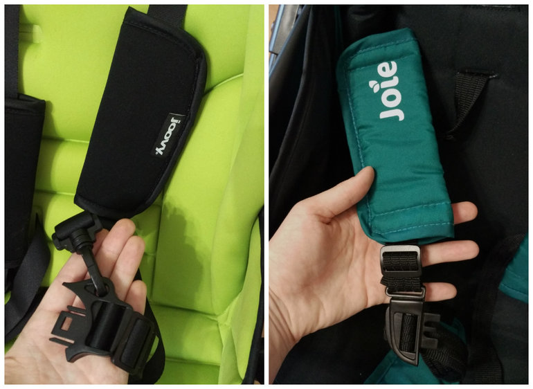 У Joie небольшая пластиковая задвижка, а у Joovy - карабин. Расстегивается механизм нажатием на середину.