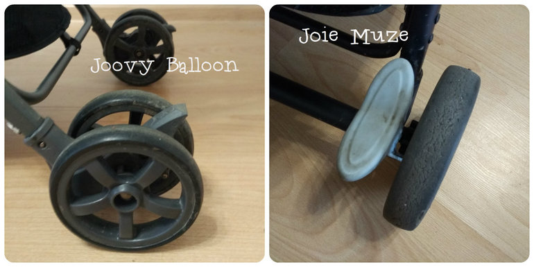 Когда меняется положение ручки, то колеса тоже меняются местами. Было непривычно катить коляску с передними не поворотными колесами. Что касается размеров, то у Joovy Balloon все колеса одинаковые - 13 см в диаметре, а у Joie различаются - 15 см передние и 18 см задние. Ширина колесной базы - 54 см у Joie и 45 см у Joovy Balloon.