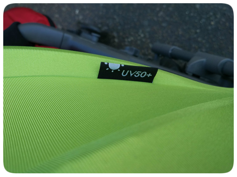 - большой капор с защитой от ультрафиолетовых лучей (UV 50+): капор закрывает ребенка полностью до ножек в любом положении и сделан из тянущейся, но в то же время дышащей ткани; возможно, она даже не промокает