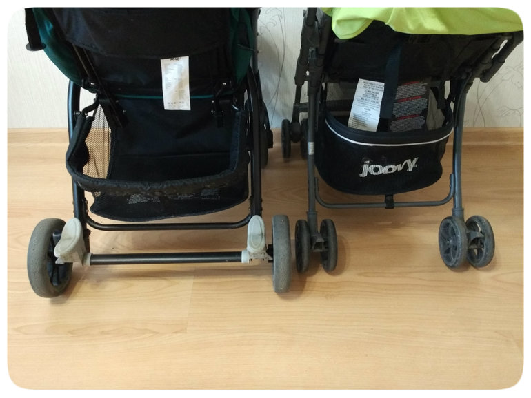 Вот по этому параметру явно есть разница: у Joie колеса одинарные полиуретановые, передние - поворотные и с возможностью фиксации. У Joovy сдвоенные полиуретановые, передние - поворотные и с возможностью фиксации.