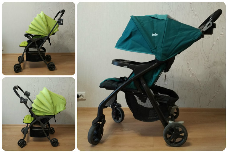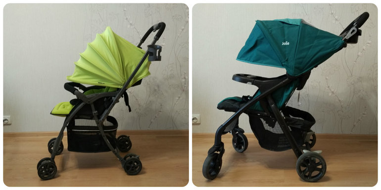 По сравнительной фотографии видно, что у Joie угол больше, но на самом деле он одинаковый у обеих колясок. Я бы не стала класть сюда совсем новорожденного, потому как обе коляски изрядно трясет на неровных поверхностях, но поставив автокресло, вполне можно и новорожденного повозить.