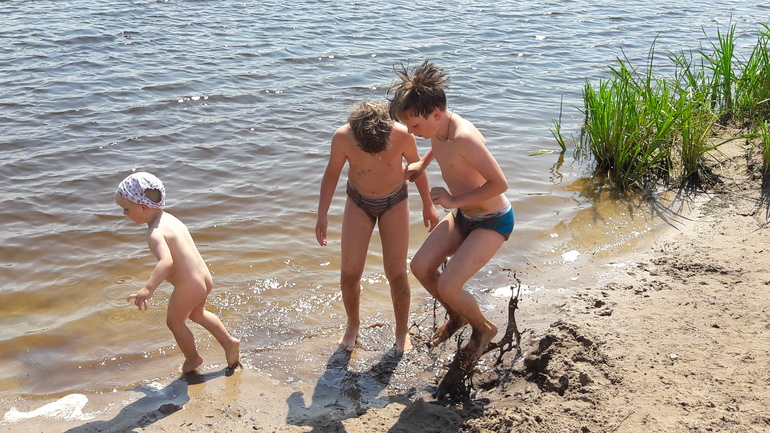 Детям сегодня было счастье). Накупались все всласть). Гриша сперва отнесся недоверчиво, раздеваться отказался, только сандалики дал снять. Старшие с визгом кинулись в воду, там еще горочка, хороший разбег можно взять, а Григорий в памперсе, штанишках, футболке и кепке только чуть ножками пробует водичку. Я хотела их поснимать, беру телефон, выбираю ракурс и вижу на экране, как Гриша вдруг берет резкий курс прямо в реку, делает несколько шагов вперед, падает и уходит весь под воду! Я, наверное, одним прыжком к нему подлетела и выхватила его из воды! Удивительно, что не утопила телефон, который был в руке.