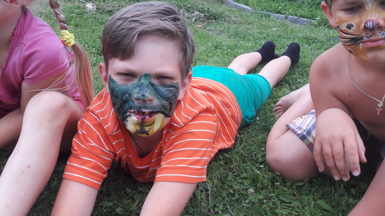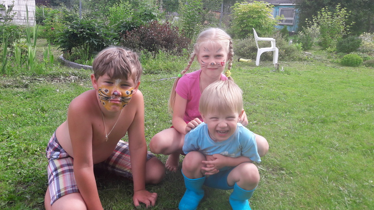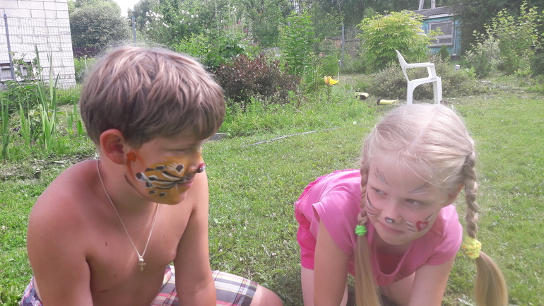 На даче Вася взял дело в свои руки, и у нас появились Леопард, Кошечка и Анаконда). Григорий гримироваться отказался и решил, что будет убегать от зверей и охотиться на них). Себя и Лешку Вася разрисовал самостоятельно).