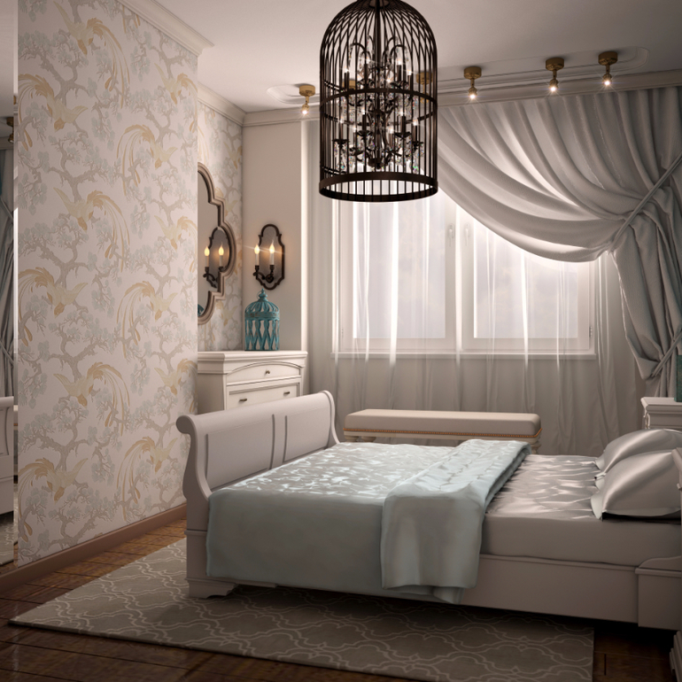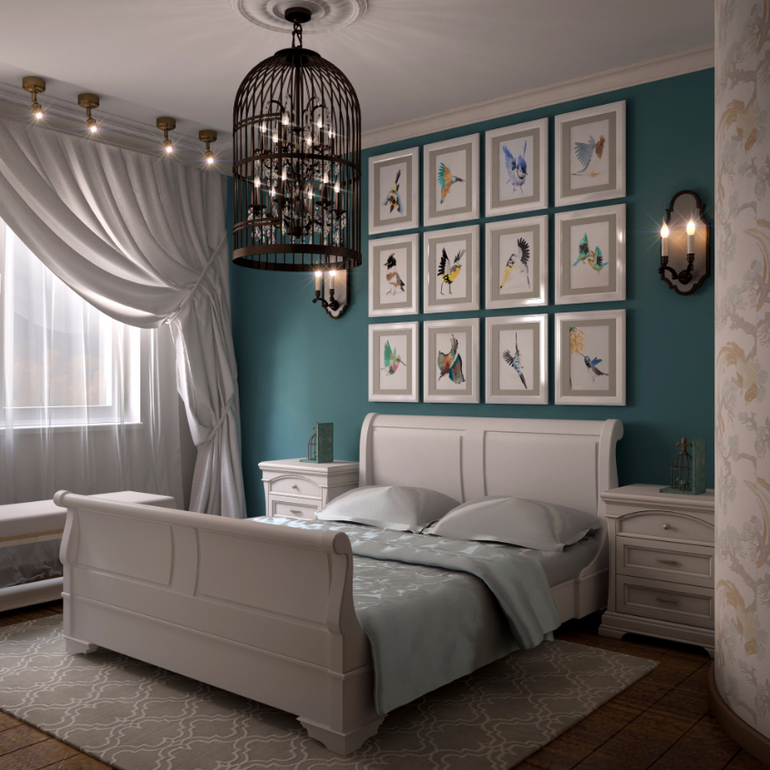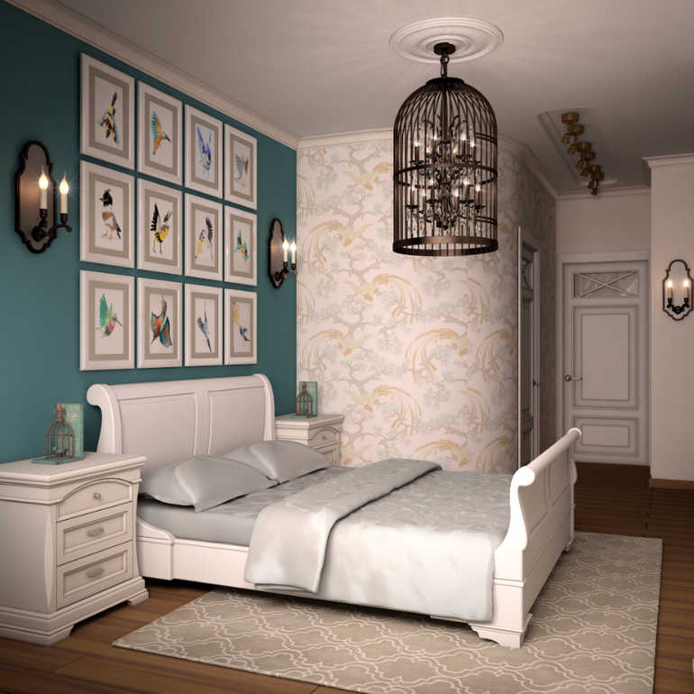 Спальню согласовали с первого раза. Заказчикам очень понравились картины с птицами на стене за кровать, и цвет самой стены. В спальне поместилась не большая гардеробная за отдельной дверью и вход в основную ванную. Кровать и тумбочки были уже куплены заказчиками, по-этому пришлось остальной интерьер создавать с учетом этой покупки.