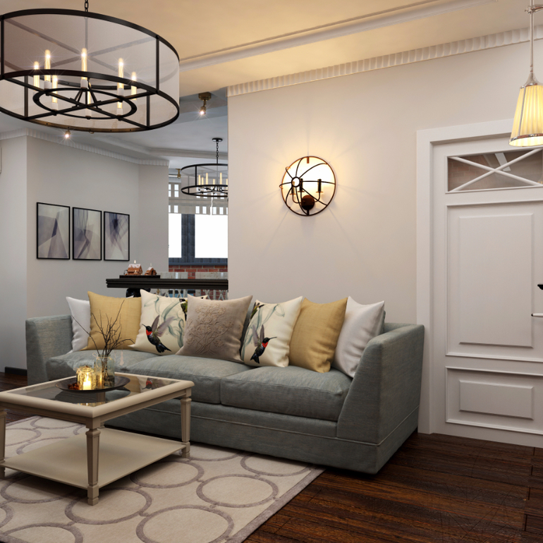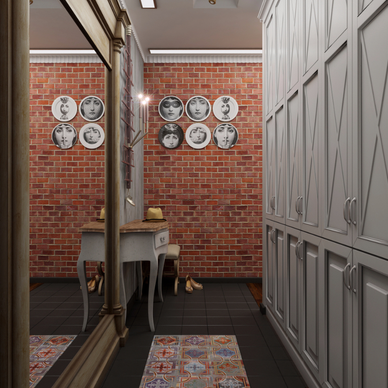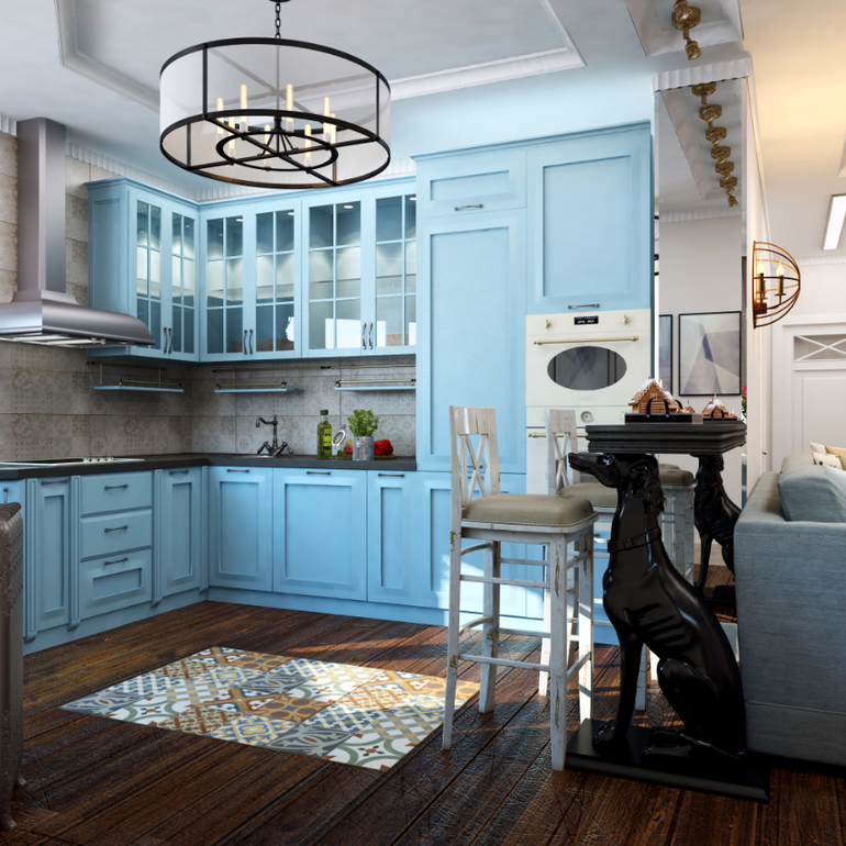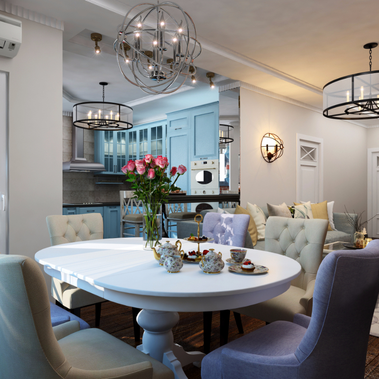 Здравствуйте. Расскажу Вам про свой проект квартиры 90 кв.м. в Подмосковном городе Пушкино. Заказчикам меня порекомендовали друзья, которым я сделала проект. В связи с этим было полное доверие со стороны Заказчиков. Это благоприятно повлияло на проектирование. Заказчики во время работы над проектом жили в Ирландии. Глава семьи- работает в посольстве, и целый год они провели по долгу его службы за границей. Общение велось иногда по Скайпу , в основном по переписке. Планировка квартиры была благоприятной для размещения просторной кухни-гостиной, спальни с не большой гардеробной, детской, двух санузлов. Большая лоджия проходила через три помещения ( гостиную, кухню и детскую). Лоджию мы разделили и сделали три входа из каждого помещения. В итоге появились: мини-кабинет для главы семьи, игровая для детей, и продолжение кухни. Эскизы утверждались почти с первого раза, были корректировки, но не значительные в зоне гостиной-кухни. Пришлось поискать цвет, в итоге остановились на серо-голубом цвете кухни. Заказчики ставили задачу создать интерьер актуальный сегодня, эклектичный, с возможностью привносить в него любой декор, который они привезут из-за границы.