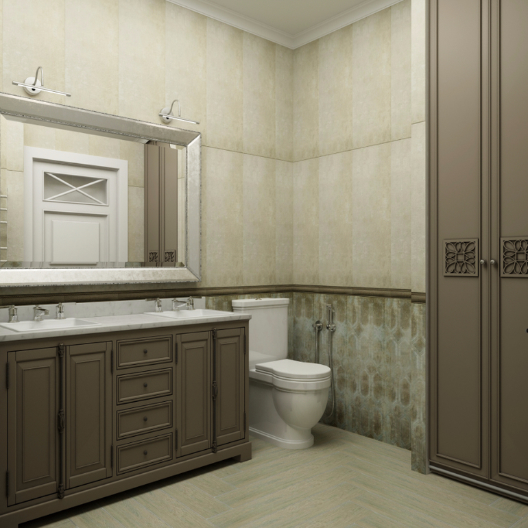 В квартире получилось спланировать два санузла. Вход в основную ванную комнату из спальни. В ванной поместилась, в специальной нише закрытой дверками, стиральная машина, и полки для химии.