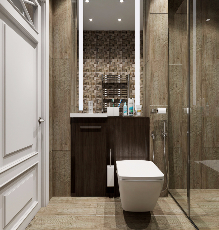 Гостевой санузел с душевой. Инсталяцию и бачок для унитаза спрятали за деревянной конструкцией, которая так же является шкафом под раковиной.