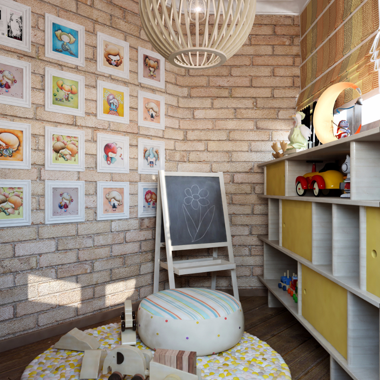 Детская для двоих мальчиков, возраст 3 и 1 год. К детской присоединили балкон, утеплили его и превратили в игровую. Пастельные тона и не тематический декор, дают простор для фантазии.