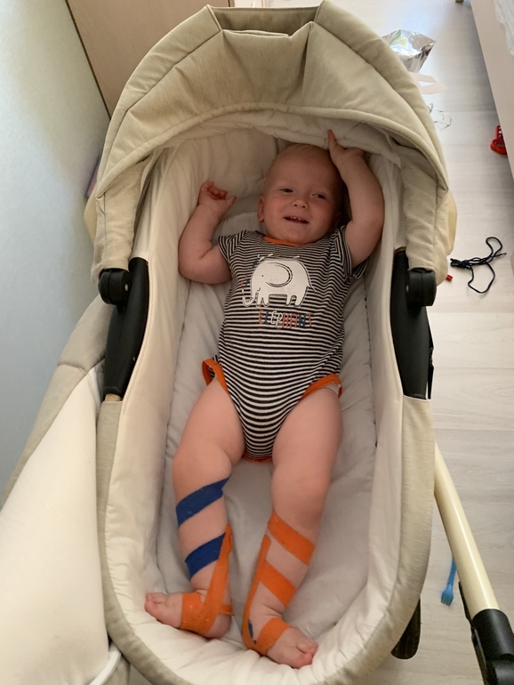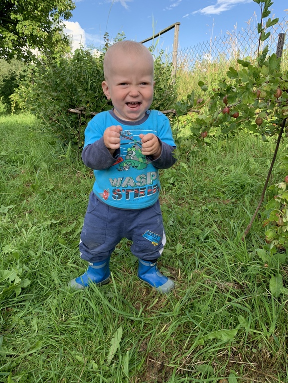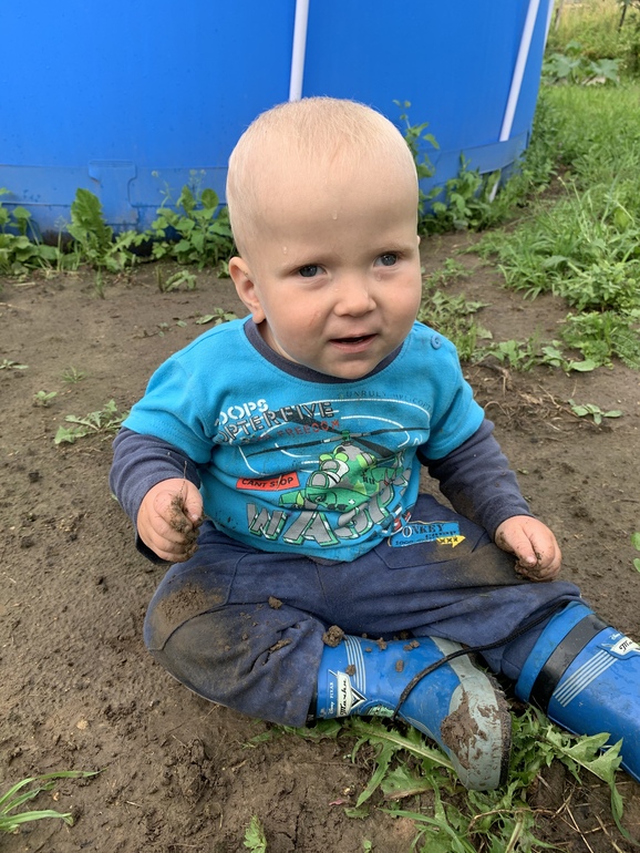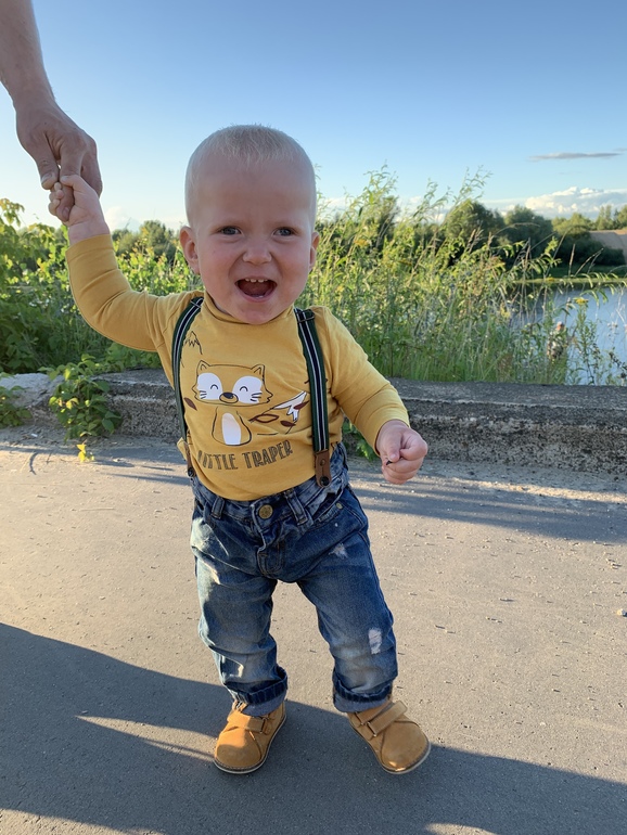 Ходит ещё немного, но хорошо группируется при падениях, ни разу еще плохо не упал, больше ходит за руку, берет твою руку в свою и тянет куда надо