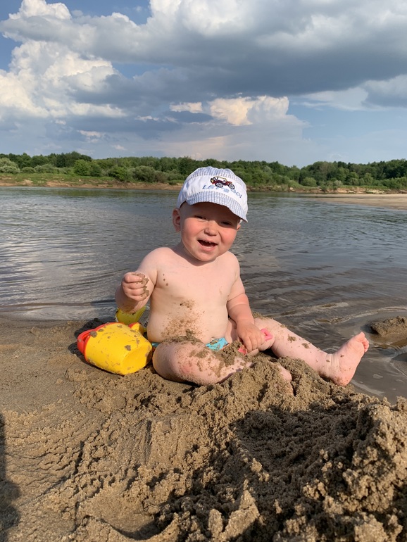 Любит возиться с песком(насыпает в ведерко, высыпает) совочком или руками