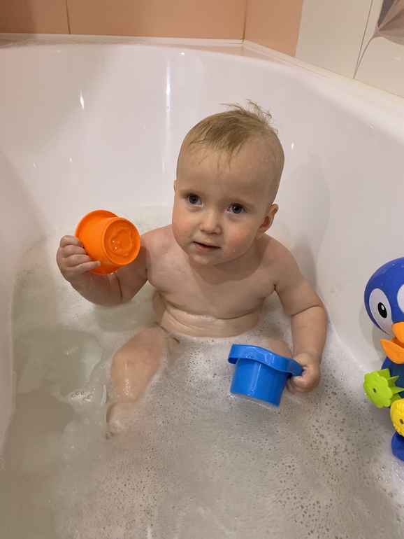 Болтает на своём языке. Из слов мама, баван/баан (банан), баба(на любую седую тетю), ав-ав, бах, ам-ам. Все предметы которые гудят - ввввввввв, темно-ммооо. Знает части лица, все показывает на себе и на других. Из частей тела знает коленки, живот, пупок, грудь.