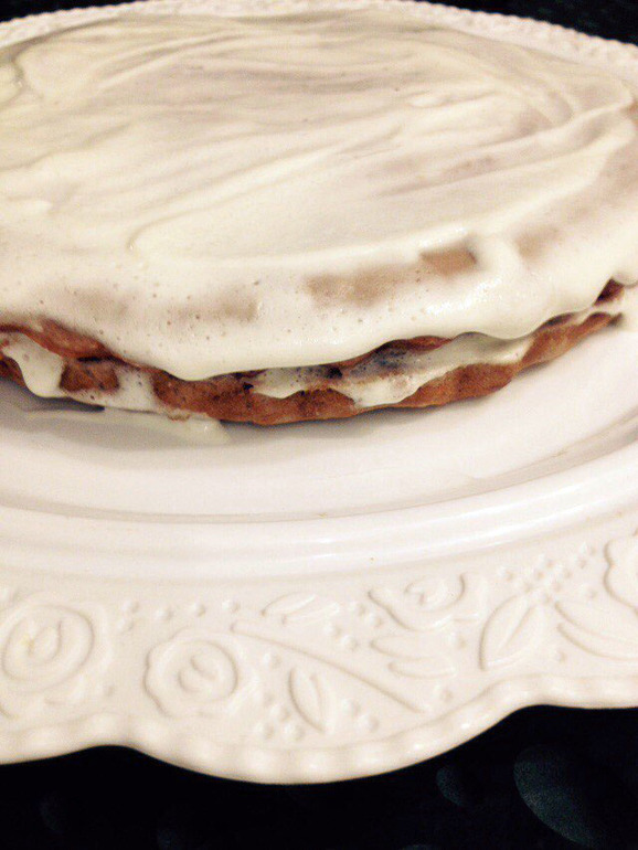 Можете оставить так ...или можно разрезать на два коржа и промазать кремом. Крем: 0,5 стакана сметаны взбить с 1 ст. ложкой сахара (если варенье было сладкое); 200 г размягченного сливочного масла взбить с одной банкой сгущенного молока, можно добавить в часть крема 1 ст. ложку какао и потом верхний корж намазать светлым кремом и сверху сделать дорожки из темного. Можно украсить свежими ягодами (черешни, клубники).