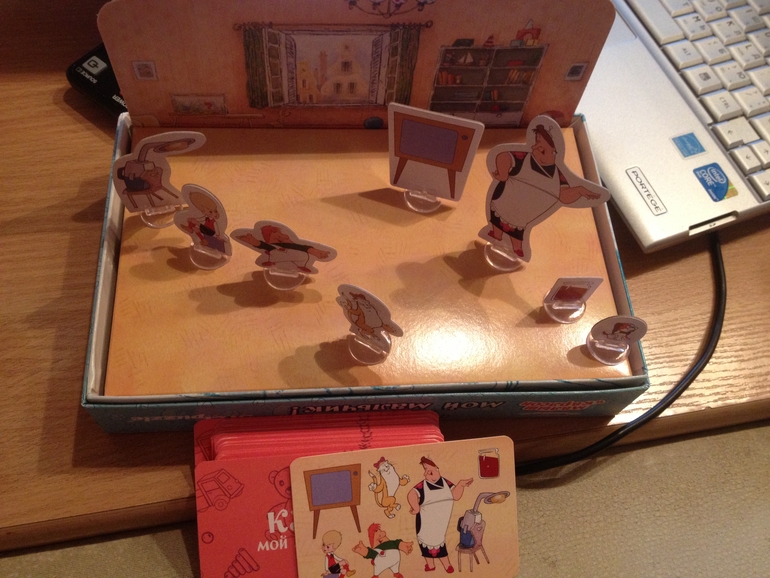 Карточки. аккуратные, в меру яркие, размер удобный. Только тут небольшие странности возникли: в инструкции указано, что карточки 33, у нас оказалось 32 карточки игровых