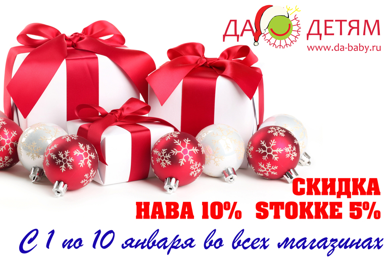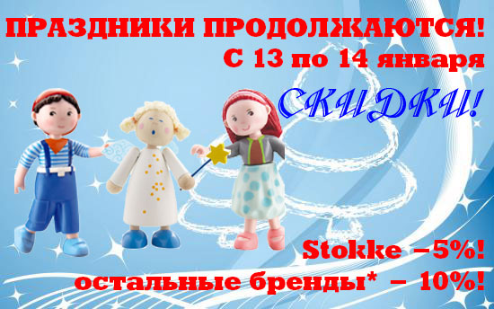 Праздники продолжаются! В период с 13 по 14 января во всех оффлайн магазинах и в интернет магазине Вы можете приобрести любой понравившийся Вам товар со скидками. На весь ассортимент бренда Stokke скидка 5%, на Haba, Italtrike, Picci - 10%.