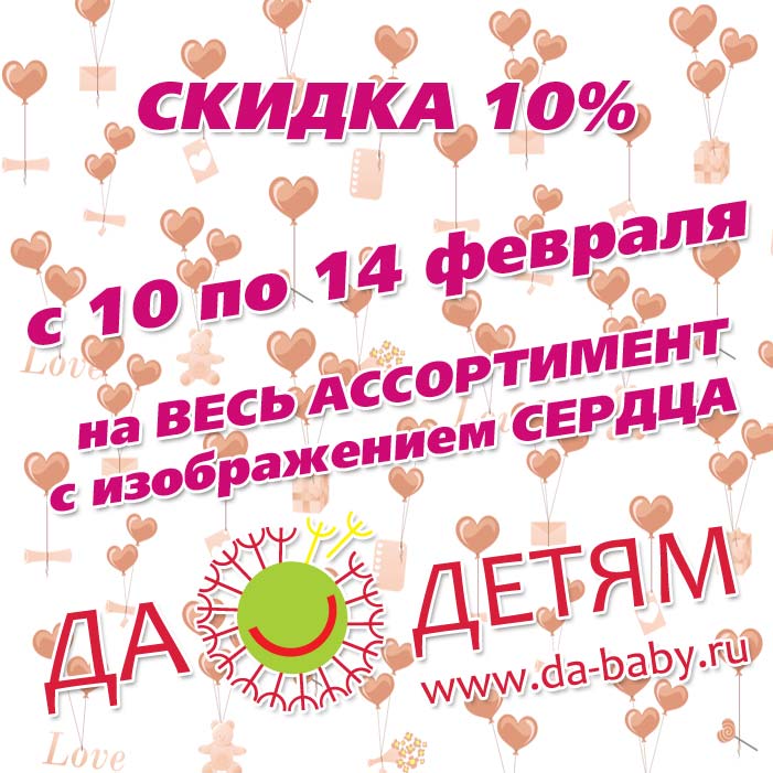 Дорогие друзья! С 10 по 14 февраля во всех наших магазинах и в интернет-магазине www.da-baby.ru вас ждут СКИДКИ 10% на весь ассортимент* с изображением сердечек!