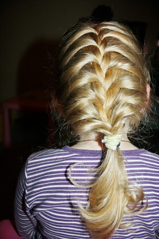 дело было вечером, учили стишки и выдался момент,когда Даша не скакала по квартире...(что бывает редко),мама без расчески попыталась поучиться плести ,получились во что...