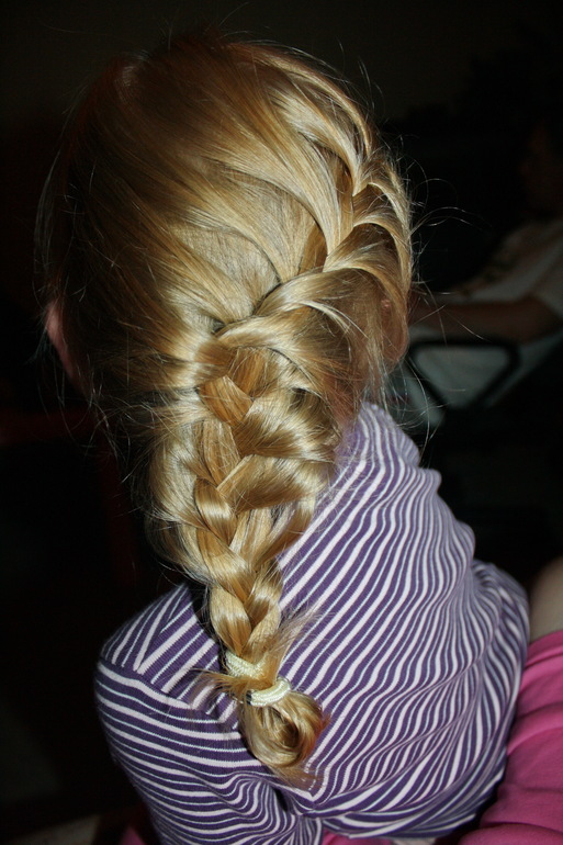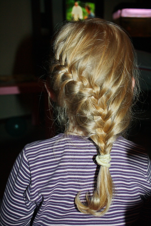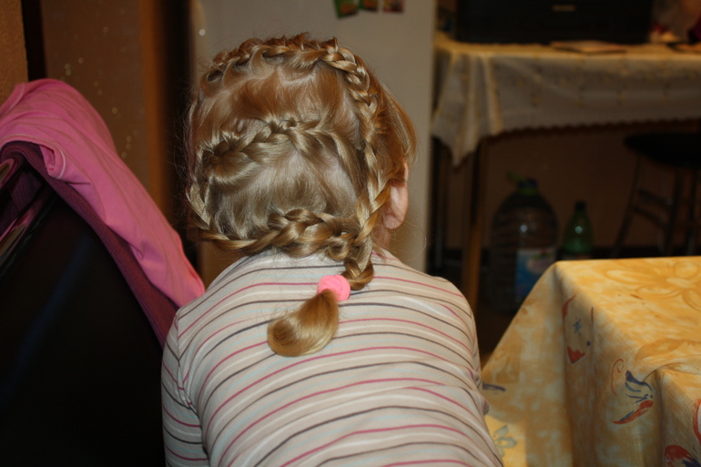 дело было вечером, учили стишки и выдался момент,когда Даша не скакала по квартире...(что бывает редко),мама без расчески попыталась поучиться плести ,получились во что...