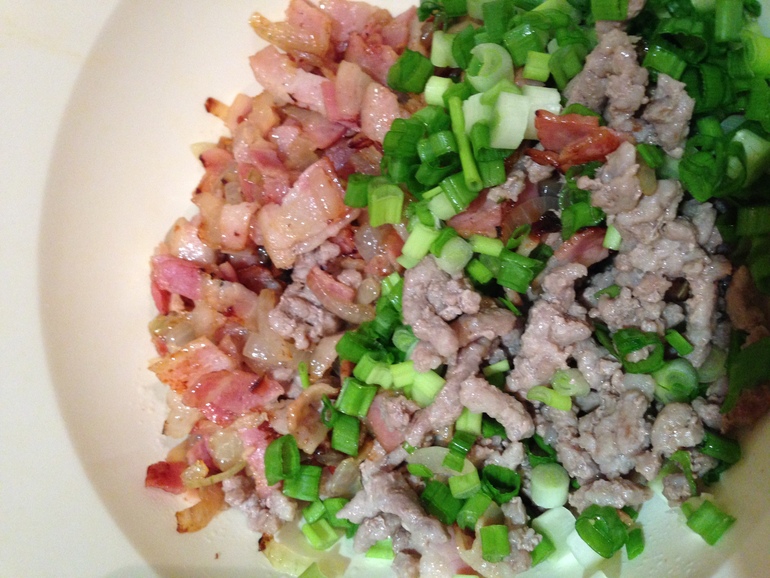 3) Готовим начинку на ваш вкус. У меня была смесь из обжаренных фарша, бекона и репчатого лука+зеленый лук.