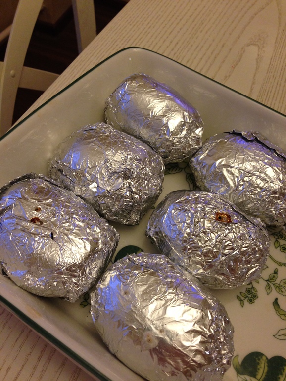 1) Запекаем в фольге ровненькую практически одинакового размера картошку до почти готовности.