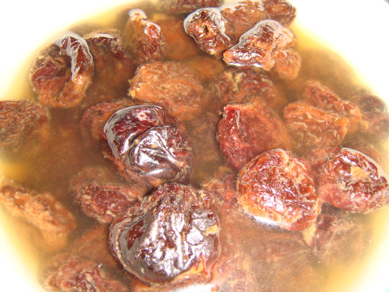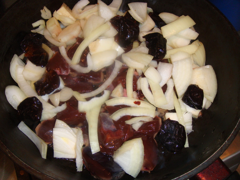 500 г говяжьей печени порезать на кусочки размером с палец, посолить. Потушить до готовности вместе с черносливом и 3 луковицами: