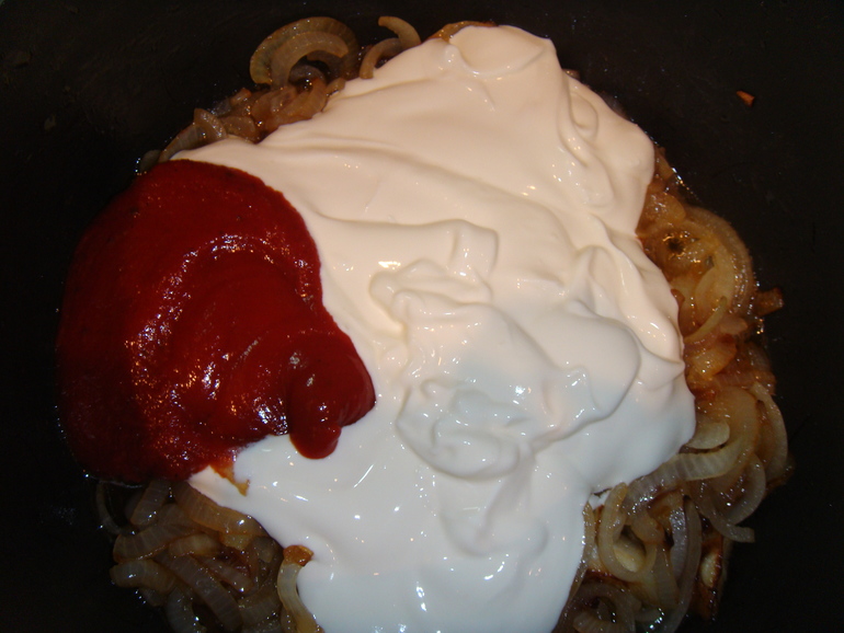 Добавить 5 ст.л. сметаны и 2 ст.л. томата: