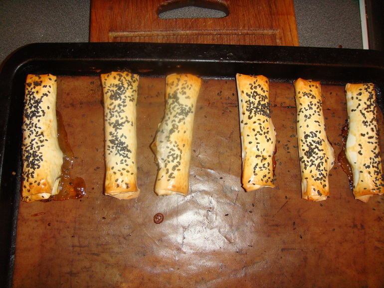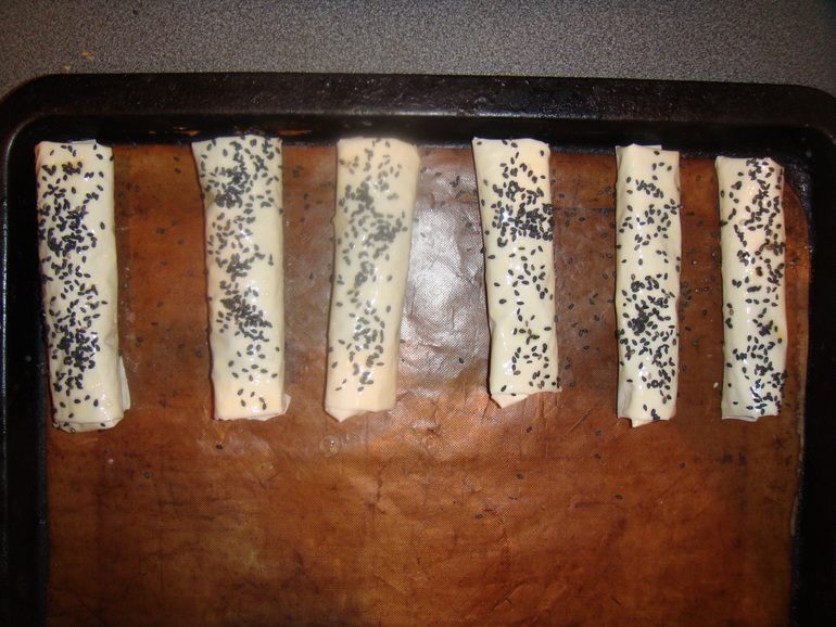 Разложить "сигары" на противне, смазать яйцом, посыпать кунжутом: