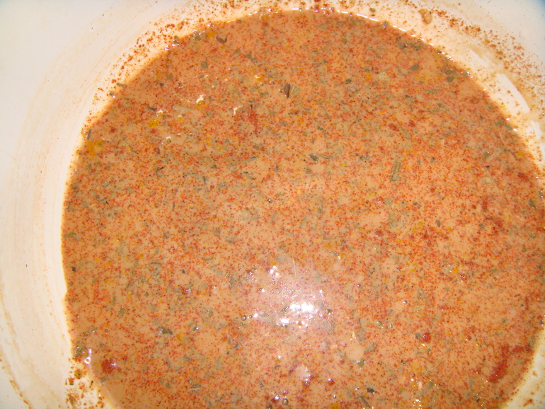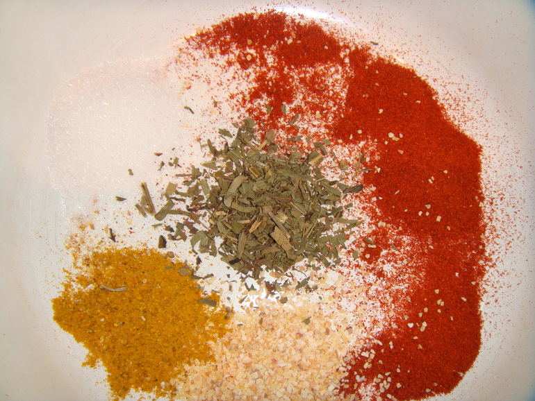 Смешать в миске паприку, сахар, куркуму, орегано, сухой чеснок: