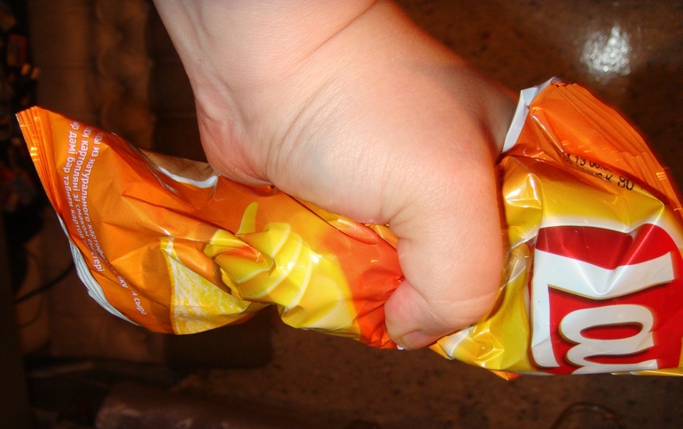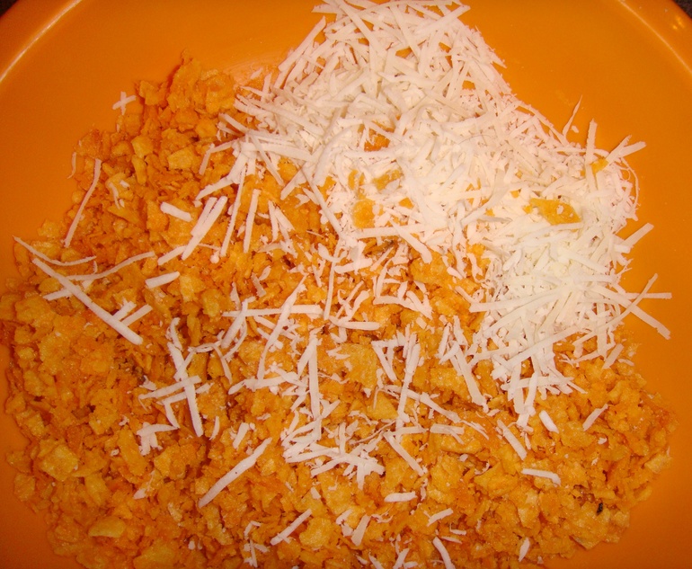 Пачку сырных чипсов побить скалкой или помять руками в пакете до мелких кусочков: