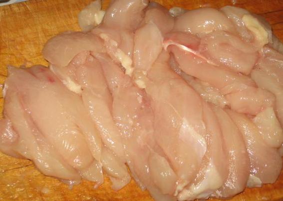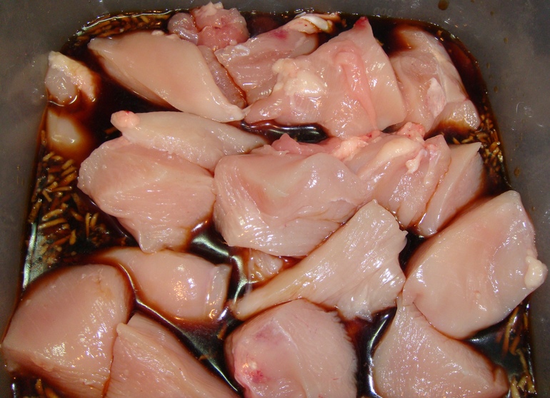 Мякоть курицы нарезать кубиками, опустить в соус: