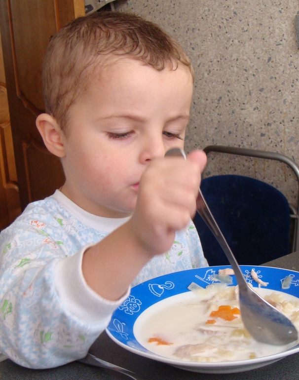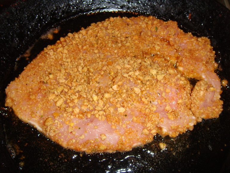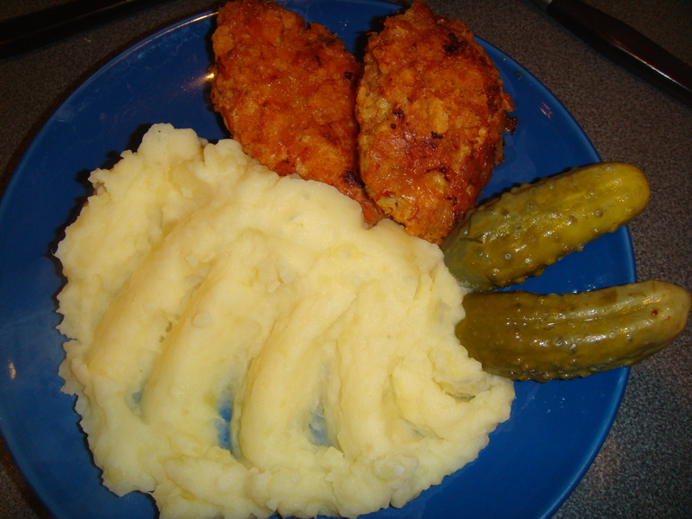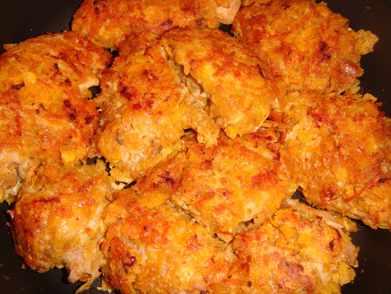 На этот раз готовили куриные наггетсы,отбивные с сырной корочкой, "космический" супчик, курочку "в пальтишке", "мясо аллигатора".