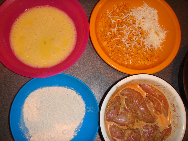 Затем каждый кусочек куры обвалять в муке, потом в разбитом яйце и в чипсах: