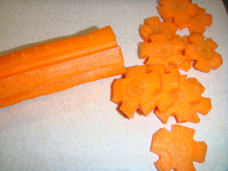 Морковку почистить, сделать продольные канавки и нарезать на звездочки (в космическом супчике это солнышки!):