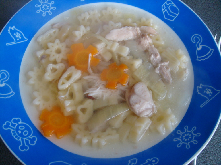 Варить 5 минут. В это время снять мясо с костей и вернуть его в суп. Проварить еще пару минут и разливать по тарелкам космический суп с ракетами и летающими тарелками: