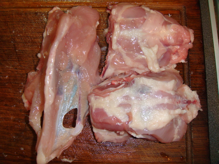 Срезать с килевой кости филе без кожи. Отделить и отложить малое филе (оно в этом рецепте не понадобится):