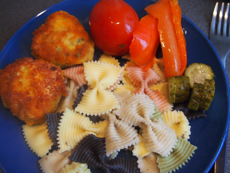 Обжарить на растительном масле. Подавать с пастой и овощами: