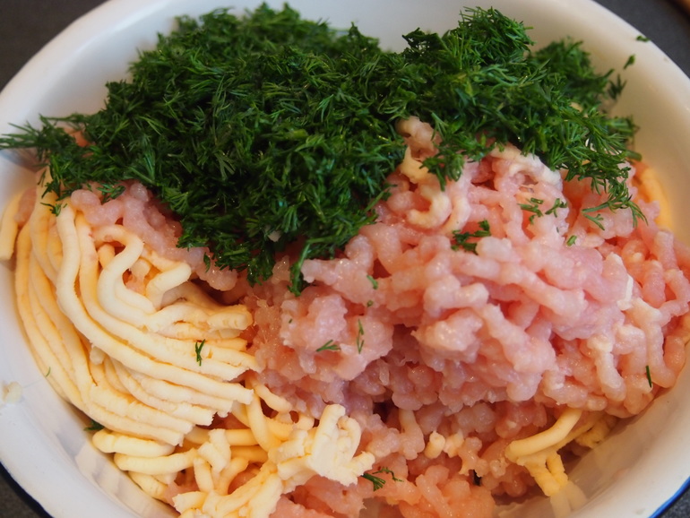Смолоть курицу и твердый сыр, мелко нарезать укроп: