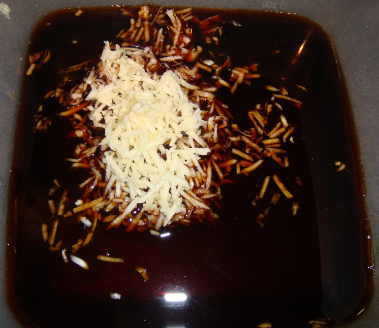 Не знаю кто сравнивал вкус курицы и крокодила, но ко мне рецепт пришел с таким названием. Делается всё очень просто. Натереть головку чеснока, залить стаканом соевого соуса: