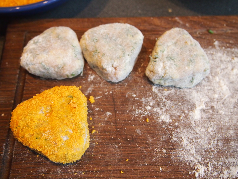 Добавить соль и хорошо вымесить фарш. Обвалять в муке, обмакнуть в разбитое яйцо и обвалять в панировочных сухарях: