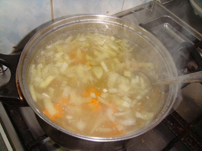 Из готового бульона вынуть косточки и положить морковку и мелко нашинкованный репчатый лук: