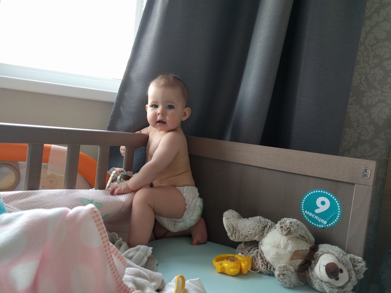 -хорошо сидит и ползает,но самостоятельно мало играет,если я рядом,то орет Мамамамамэ! Типа забери,хочу к тебе)))