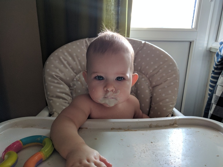 - кушаем каши,мясо,фрукты и овощи. Ввели творог, Варя его обожает! Открывает рот навстречу ложке с творожком!