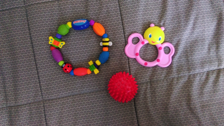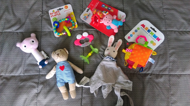 Погремушки, прорезыватели, шуршашие, гремячие (купила сама):
