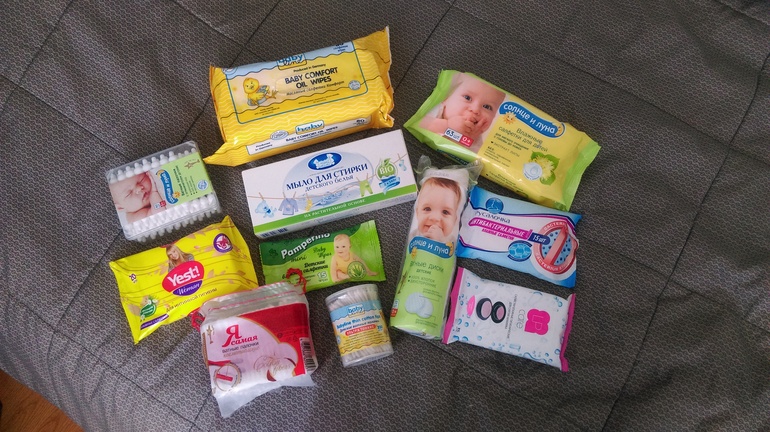 Влажные салфетки обычные детские, масляные (говорят, хорошо ими отмывать попу от мекония), антибактериальные для меня, для снятия макияжа (тоже для меня), для интимной гигиены, ватные палочки с ограничителями, ультратонкие и обычные, ватные диски детские. Сюда же на фото попало мыло для стирки Наша мама, застирывать пятна перед стиралкой. Ну и вдруг я руками постирать захочу)) Но сомневаюсь)))