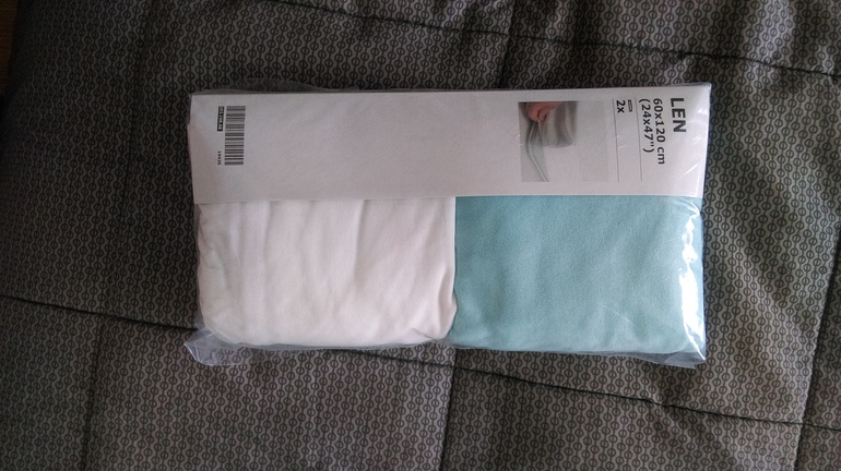 Также успела купить комплект натяжных простыней в ИКЕА, которые сейчас не продаются, потому что они турецкие и санкции... (450 рублей).