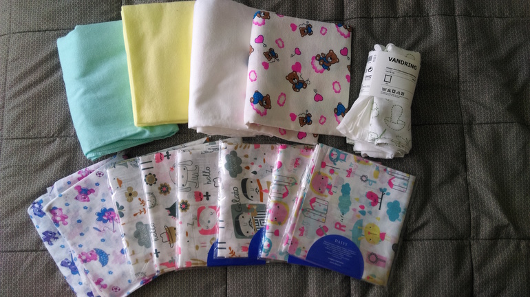 Купила новых пеленочек в Ашане фирмы Daisy: бязевых 6 шт, фланелек 4 шт и ситцевых 2 шт и упаковку муслиновых в ИКЕА (2 шт) (1100 руб)