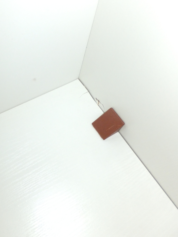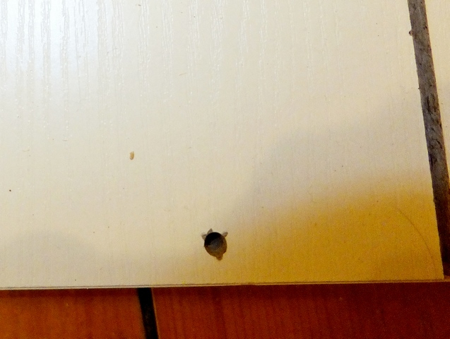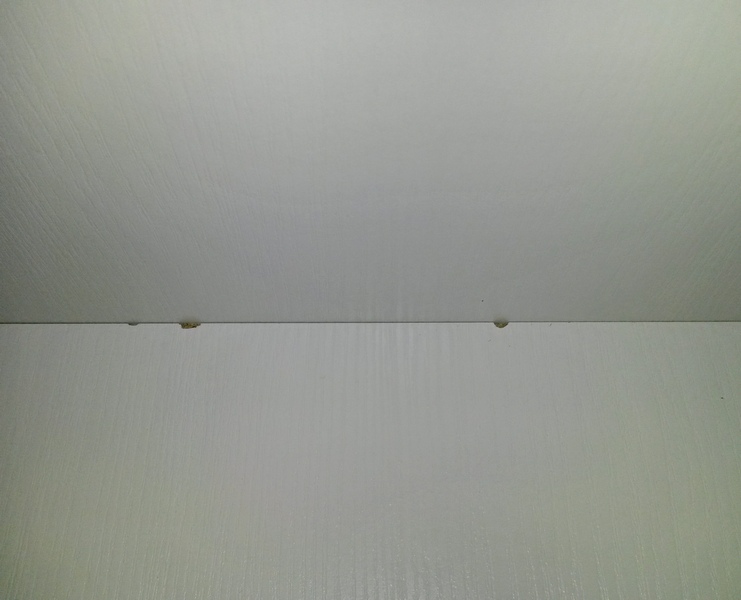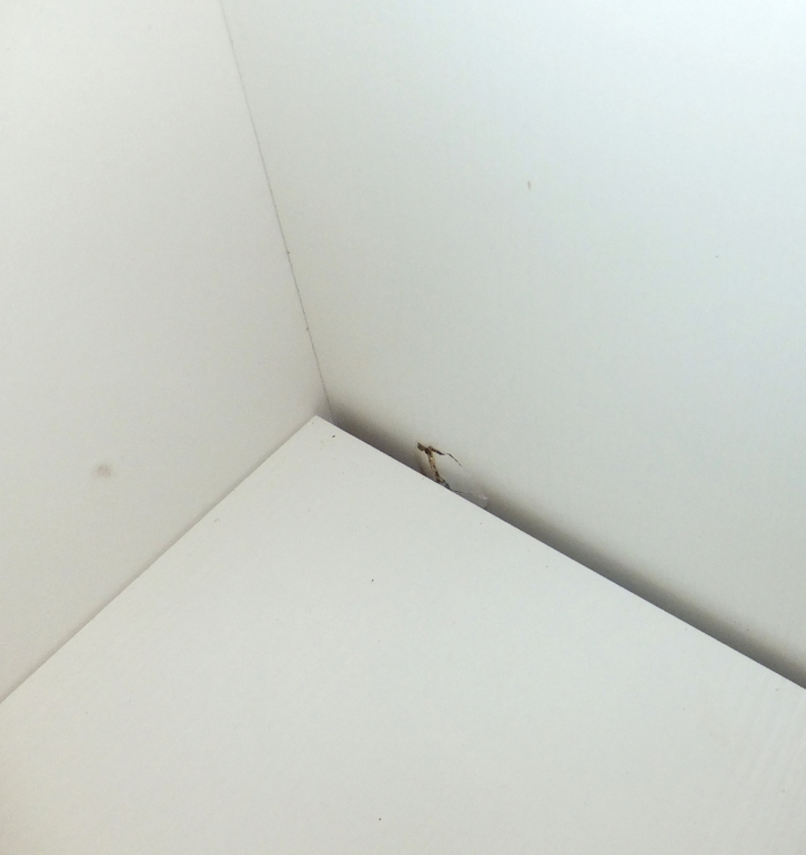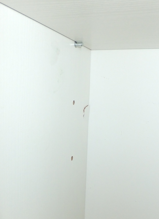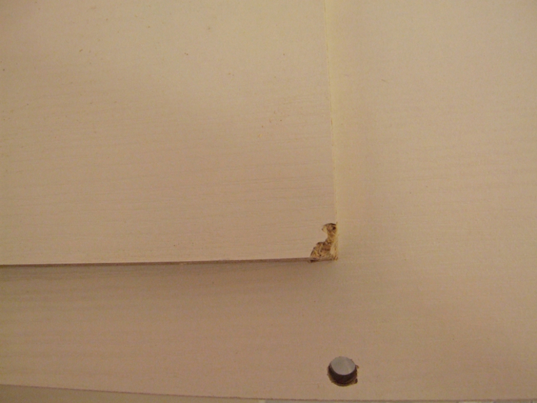 Собрали шкаф, - первая проблема с которой мы столкнулись, - как оказалось, у нас пол не идеально ровный, а под небольшим наклоном, и шкаф немного перекосило: заметно стало по дверцам шкафа, - в месте где створки шкафа сходятся одна створка гораздо выше другой Т.к. дверцы шкафа очень тяжёлые (дверцы сверху сделаны из другого материала, чем все детали шкафа, глянцевые). Вторая возникшая проблема - когда мы стали его передвигать с середины комнаты к стене, причём аккуратно, уже поняли с чем имеем дело, при этом : одна боковая стенка вырвалась с фурнитурой от дна шкафа, ДСП очень плохое, фурнитура вырвалась «с мясом» из ДСП, вот так отошла боковая стенка от дна: