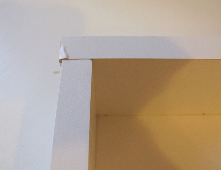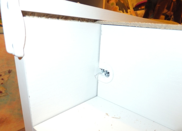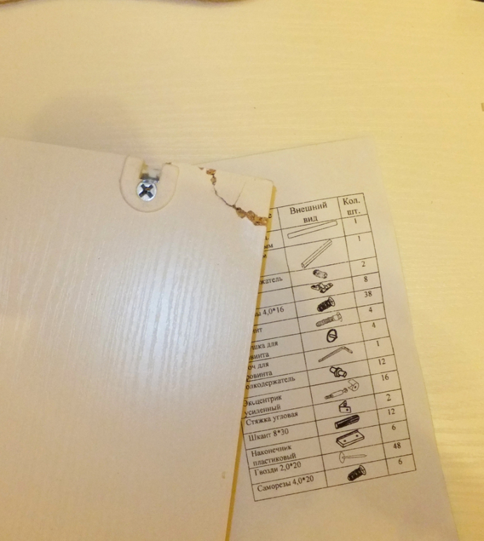 Это низ стола, при затягивании фурнитуры во время сборки, фурнитура вырывается из плиты ДСП, т.к. ДСП не прочное, белая поверхность очень некрасиво трескается: