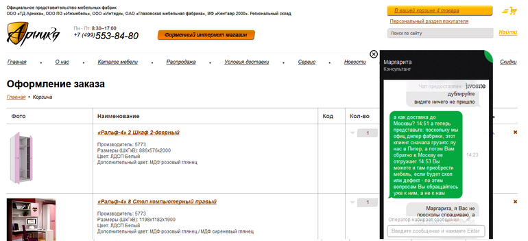 Я первоначально хотела заказать с С. Петербурга , так как там нашла эту мебель со скидкой 10% в интернет-магазине и уж очень хотелось купить дешевле, но что бы долго не ждать доставку, решила написать в «Арнику» - мол вон тот магазин продаёт дешевле, и не хотели бы вы мне сделать скидку, на что тогда мне ответили: