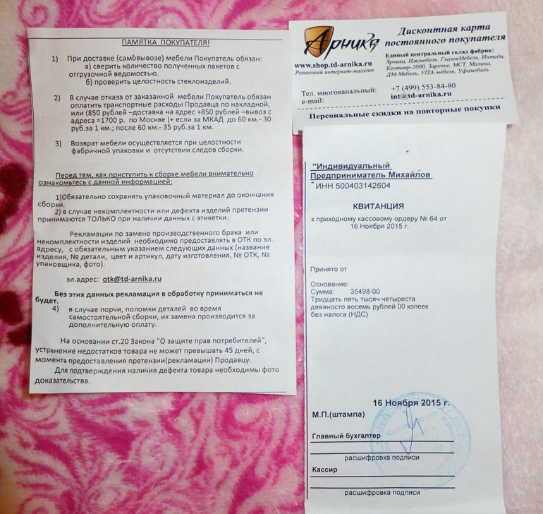 Позвонив в отдел рекламаций в 16:50 в ТД «Арнику» мне нахамили и сказали позвонить завтра, т.к. это долго: заказывать инструкции с самого завода, а рабочий день уже подошёл к концу и бросили трубку. Второй раз пришлось им звонить, когда, открыв очередную коробку обнаружили поломанные детали, так же весьма неохотно сказали: - Собирайте! А мы потом детали пришлём. Замечательно! Сначала я собираю мебель, потом, через месяца два они привозят мне детали, я разбираю мебель, вставляю новые детали… а если не собирать, то коробки занимают весь коридор, тем более мы уже начали собирать. Заводом изготовителем заявлено, что мебель выдерживает до 10 сборок!, но это не так, мебель выдержит максимум две сборки, и то дай бог, что бы не шаталась и не разваливалась.